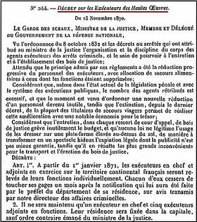 Le décret du 26 novembre 1870 va supprimer la fonction départementale des Exécuteurs de Hautes Œuvres.
