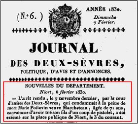 - Le 3 février 1830, elle est exécutée en place publique de Niort.