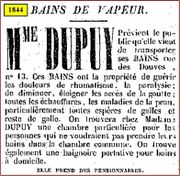 - En 1844, Mme Dupuy propose des bains de vapeur à domicile permettant de soigner toutes sortes de maladie de la peau (Voir photo).