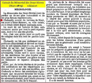 Le 21 mai 1856 le tribunal de Niort condamne 14 républicains dont Chabaudy.