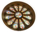 - -deux vitraux en forme de rosace sont situés au dessus de l’entrée principale (Voir photo) et à droite dans le chœur.