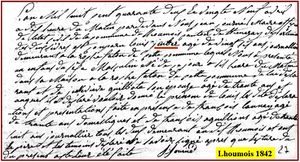 - Cette transcription par le maire de Lhoumois, en 1842, est sans doute due à une approximation de compréhension phonétique, les parents étant illettrés.