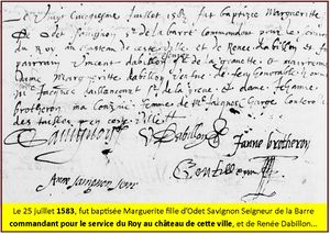 - Celle-ci l’avait héritée de son père Odet Savignon, sieur de la Barre marié à Renée Dabillon en 1578.