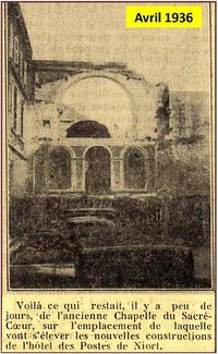 - En avril 1936, lors de l’ouverture de la rue Ernest Pérochon, on démolit, sous les yeux ébahis des Niortais, la Chapelle du sacré-cœur.