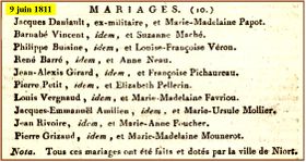 - Les dix mariages (voir photo) ont été célébrés le 9 juin 1811 par Joseph Emmanuel Busseau maire de Niort.