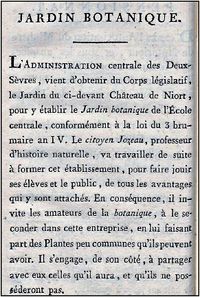 | + | [[Fichier:An VII Jardin Botanique.jpg|200px|right|thumb|Notes sur l'Almanach des Muses de l'école Centrale des Deux-Sèvres (1798).]] | ||