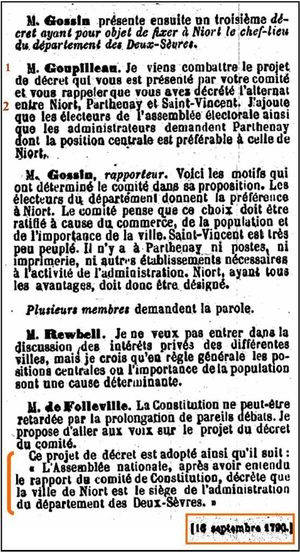 Dans la ville de Niort, il fut nommé le département des Deux Saivres ; pour l’établir, tous les électeurs s’assemblèrent dans l’église des Cordeliers de Niort.